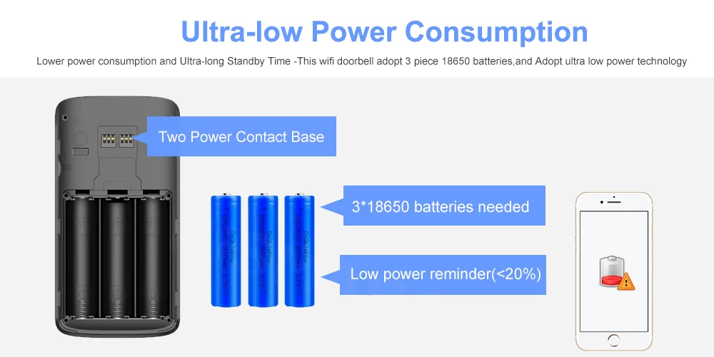 Lower power consumption and Ultra-long Standby Time -This wifi doorbell adopt 2 piece 18650 batteries,and Adopt ultra low power technology